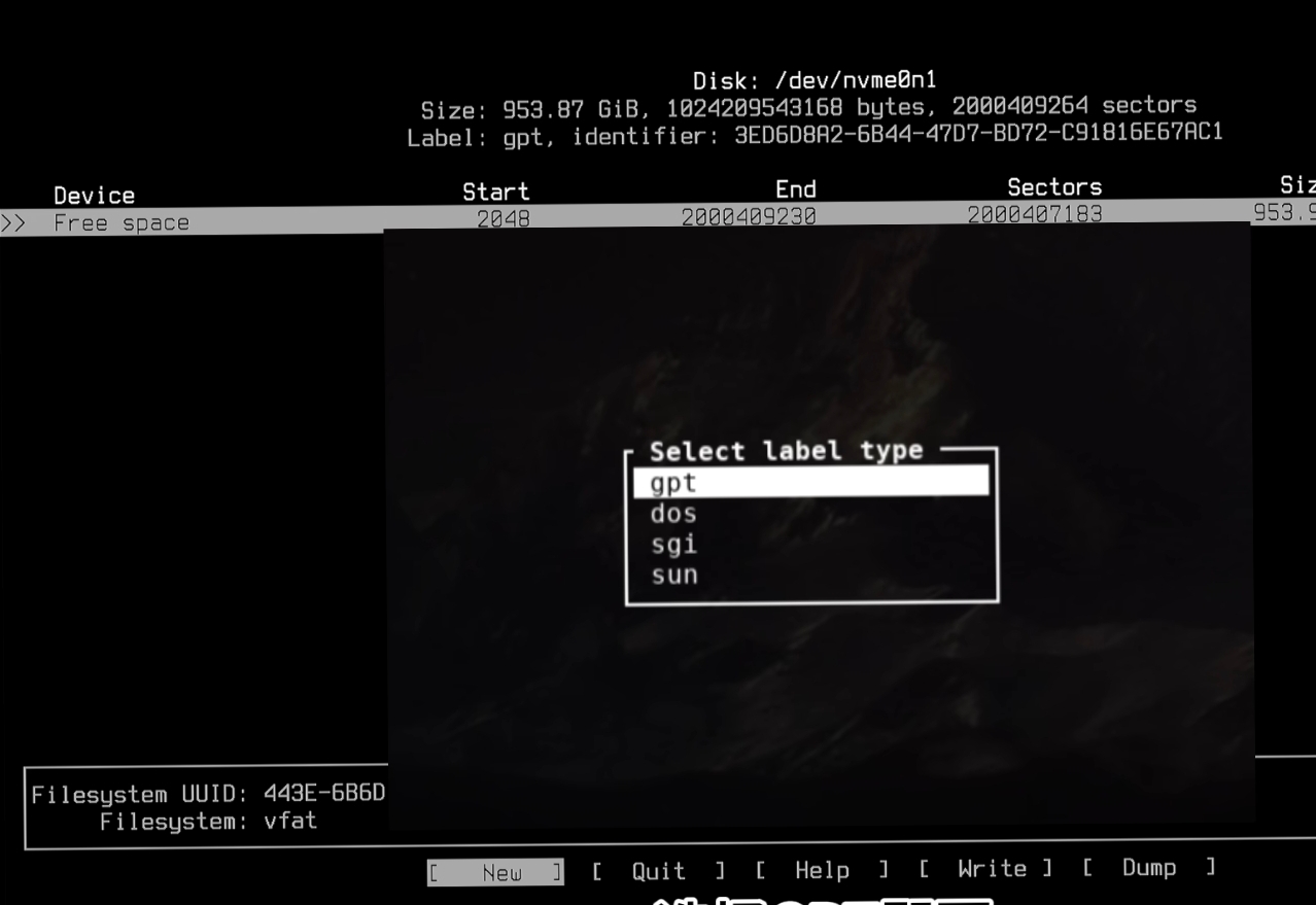 如果是一块没有使用过的新盘,会让选择一个 label type 选 gpt 即可