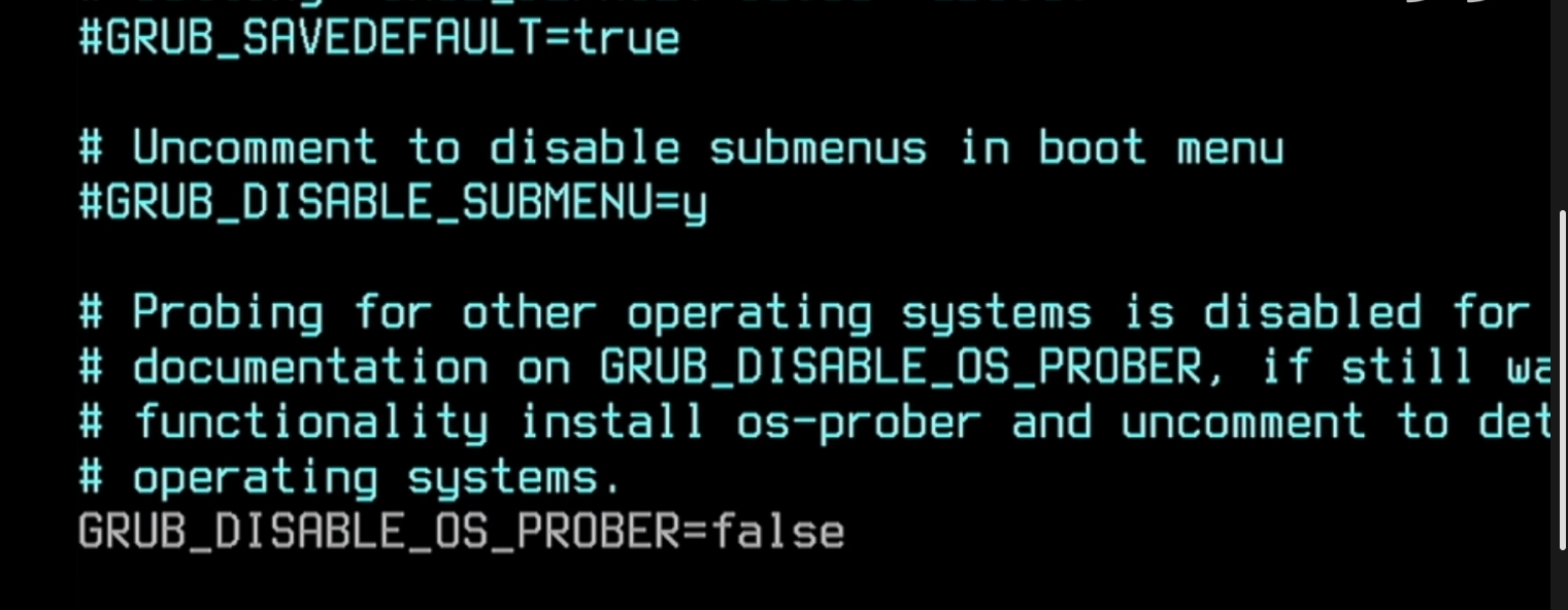 vim /etc/default/grub跳转到文件最后一行将 GRUB_DISABLE_OS_PROBER=false 的注释放开