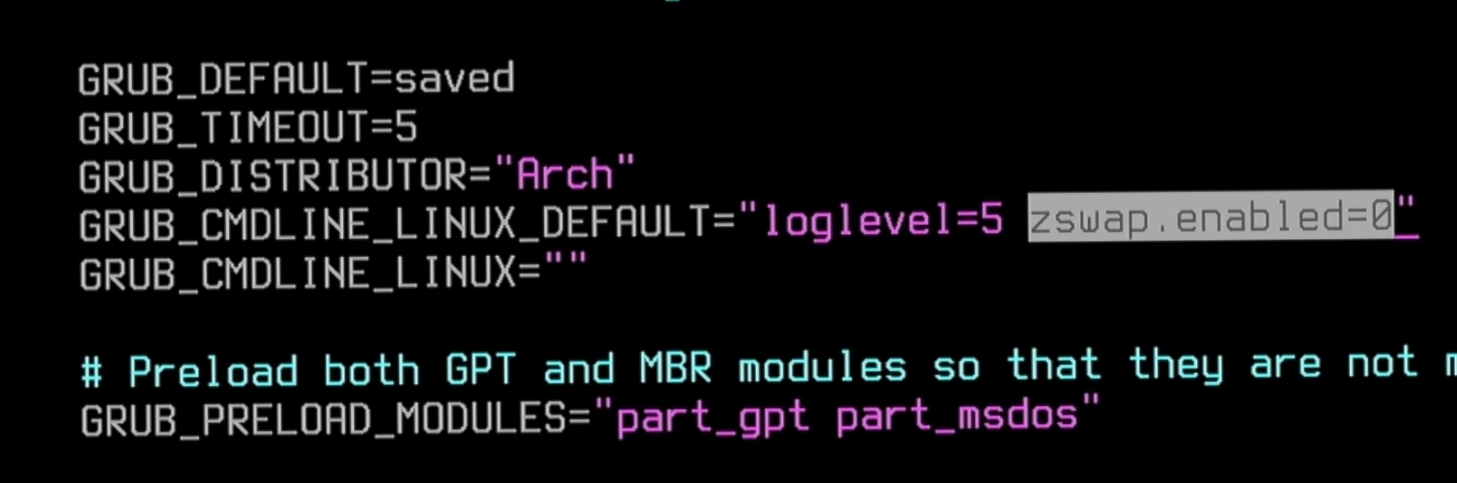 vim /etc/default/grub在 loglevel=5 后边加入 zswap.enabled=0